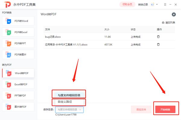 2、稍等片刻显示上传完成时,选择需要保存的位置,点击“开始转换”。
