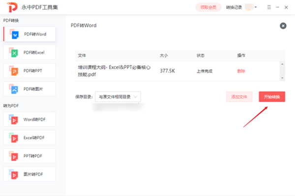 PDF转Word、PDF转Excel、PDF转PPT、Word转PDF、Excel转PDF、PPT转PDF功能操作一致,以PDF转Word功能为例介绍下具体操作。