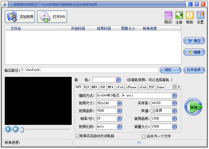 支持MOD、TOD、MTS、M2TS、TS、F4V、DV等高清视频格式转换输出常见视频格式如AVI/FLV/MKV/VCD/DVD/WMV/MP4/3GP 等格式。