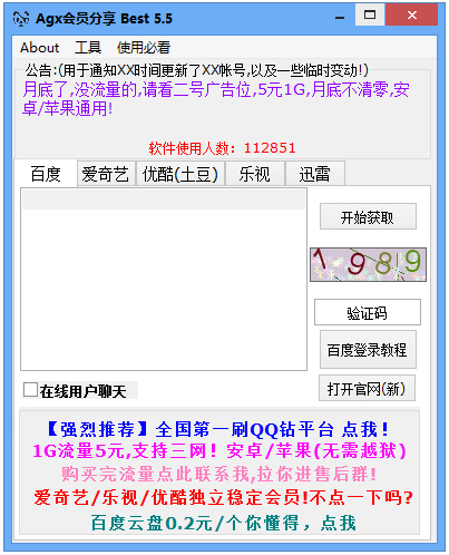 Agx会员分享器是一款非常不错的视频会员账号获取软件。该软件操作简单,支持获取爱奇艺、优酷、乐视、百度云等平台会员账号,而且每天都会更新。