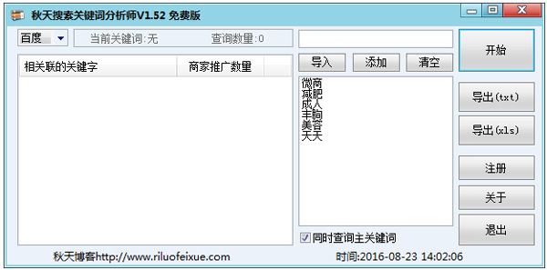 秋天搜索关键词分析师,查询搜索引擎推广商家关联关关键字数量,可以用于查询一个在搜索引擎中的关键字。比如 美发 搜索最多的10个关键,之后分析这10个关键字有多少个商家了做了商业推广暂时支持360与百度查询。