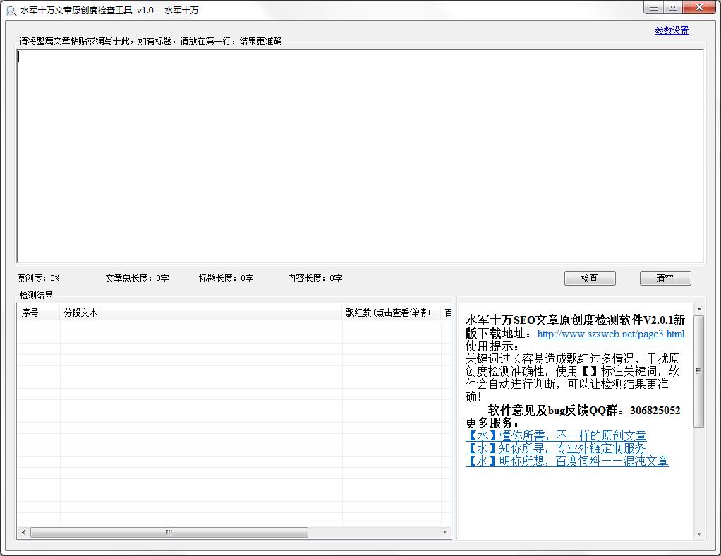 水军十万文章原创度检测工具是一款功能强大的原创检测软件,软件使用搜索引擎来帮助用户检测文章的原创性,当一些关键词在互联网上出现多次时,红色标准会浮动,这干扰了原创性检测的准确性,用户可以点击过去检查,然后更改相应的单词,从而轻松帮助用户提高文章质量。
