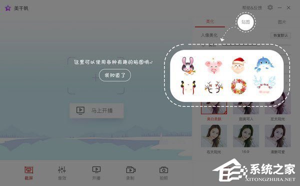 美千帆直播伴侣是一款非常不错的直播助手软件,软件支持美颜功能,还能添加各种各样的贴图和贴纸,让你的直播看起来更有趣,能够添加字幕特效等等,支持设置各种音效。