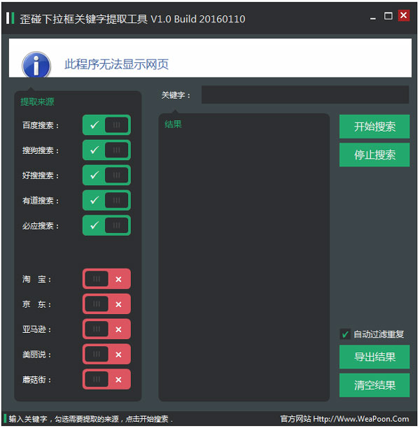 歪碰下拉框关键字提取工具是一款功能强大的seo关键词提取工具。该软件支持提取搜索引擎和购物网站等搜索建议关键字,很适合做seo的用户!