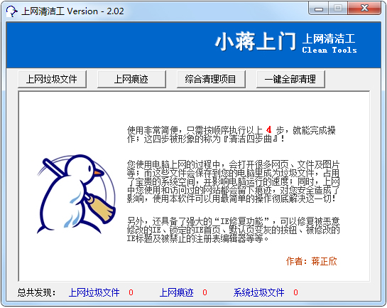 上网清洁工绿色免费版是一款十分好用的电脑垃圾清理软件。上网清洁工绿色免费版可以帮助用户将电脑上网缓存的垃圾、上网的痕迹等进行一键清理,同时还可以帮助用户针对一些注册表进行修复,让用户在使用电脑时有更好的使用体验。