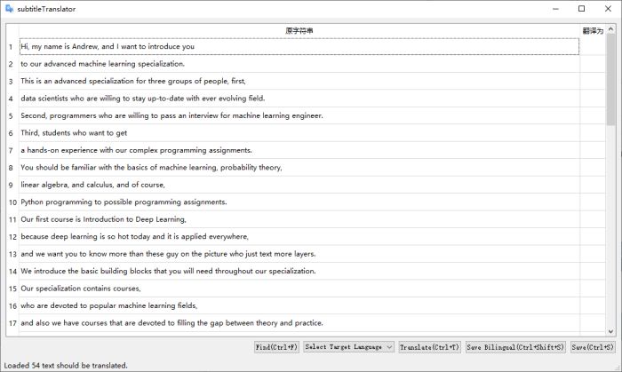 Ctrl+:翻译该字幕文件,如果没有选择语种的话,将默认翻译为简体中文Ctrl+S:保存翻译后的字幕文件Ctrl+A|t+S:保存为双语种字幕文件。
