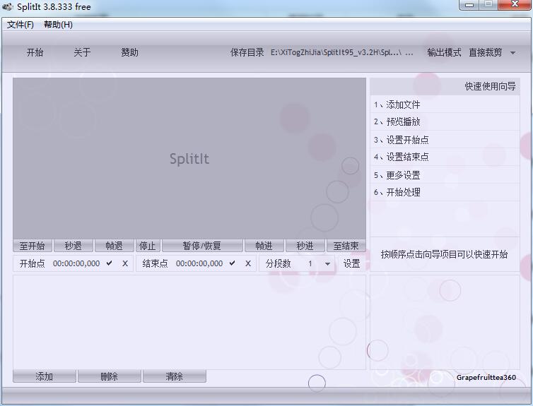 根据软件提供的向导,首先添加文件或任务列表,然后使用内置的播放器浏览内容,这可帮助用户更准确地把握切割位置定位,也支持鼠标拖放定位。使用时间点切割时,可以分别按开始点和结束点的选择按钮来快速定位;不设置时间点时,软件按分段数量分割。