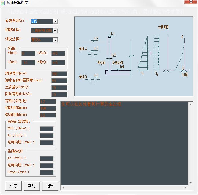 1、选择砼强度等级、钢筋种类、情况,输入标高、墙厚度、土容重、附加荷载等参数点击计算就可得出配筋计算结果和裂缝控制数值。