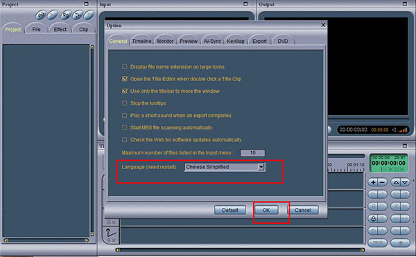 3、按F10弹出option选项,选择language语言为chinese simplified,点击OK将软件设置为中文。