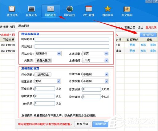 1、登陆“换链神器”进入“网站列表”点击“添加网站”并设置换链匹配条件,添加完网站后系统会在十分钟后自动更新所添加网站SEO数据,或者手工点击“更新”;