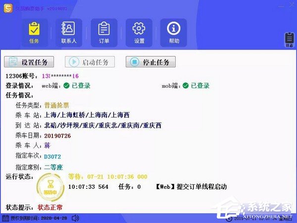 3.登陆软件后,自动以您当前账户登陆12306并刷新联系人,做为个人版购票助手,只能运行一个任务哟,如果你需要帮助朋友多人购票需使用吾易购票助手。