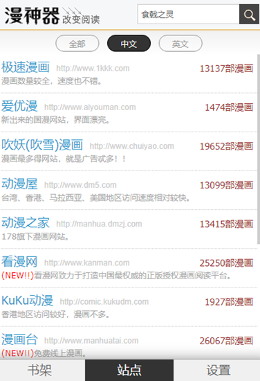 漫神器插件目前支持的站点有动漫屋DM5、极速漫画 、SF互动传媒、KuKu动漫、有妖气、腾讯动漫、吹雪(基德)漫画、动漫之家、爱优漫、台湾漫画网、新动漫网、看漫网、漫画台。支持以语言类型划分不同站点,目前涵盖繁体中文、简体中文和英文。