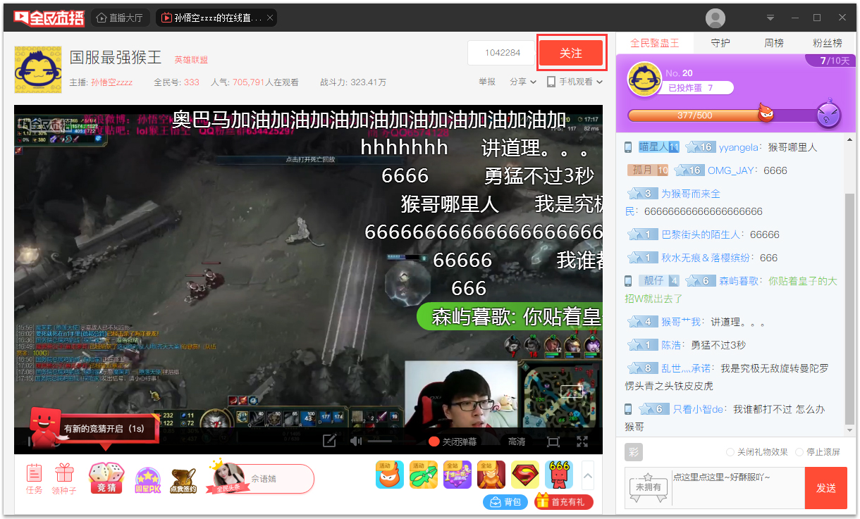 5、进入一个直播间,上方可以关注自己的主播,下次全民直播平台主播上线的时候,会自动提醒您;