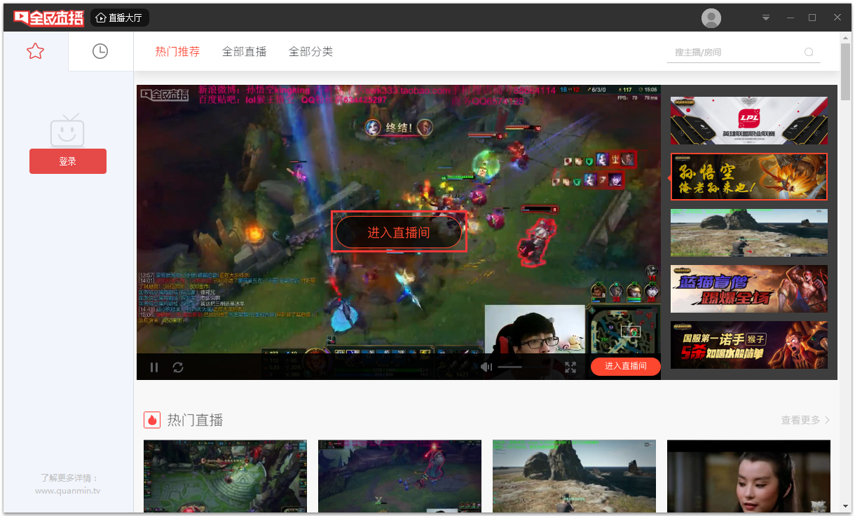 2、这里就是软件的视频区域了,点击“进入直播间”开始观看您喜欢的主播,每一个主播都是有房间ID的,如果你是粉丝,可以直接输入房间号快速进入;
