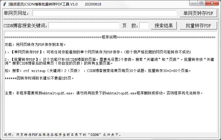 注意:本程序需要用到wkhtmltopdf.exe,请勿将同目录下的wkhtmltopdf.exe程序删除或移动。否则程序将无法转存。