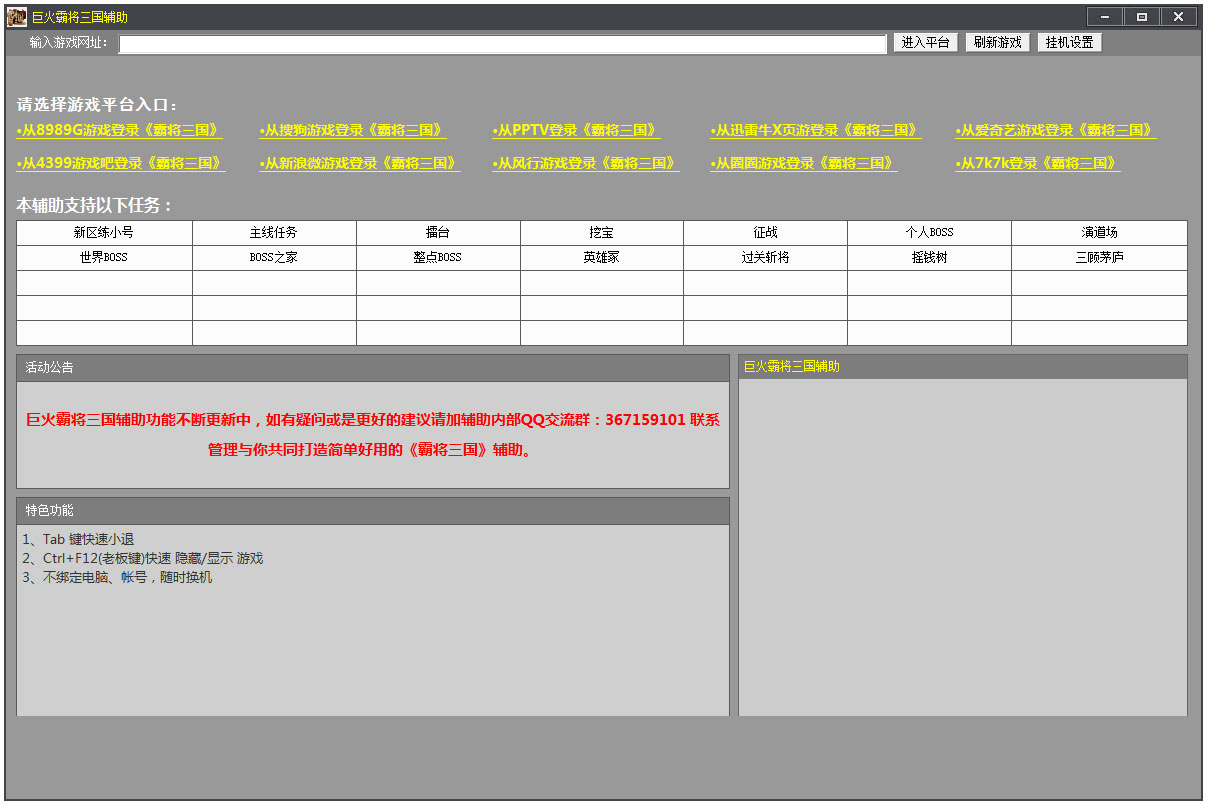 巨火霸将三国辅助是一款针对霸将三国所开发的游戏辅助脚本。能自动挖宝、自动BOSS、自动征战等,无限多开,不卡顿、效率高,资源占用比微端都少。