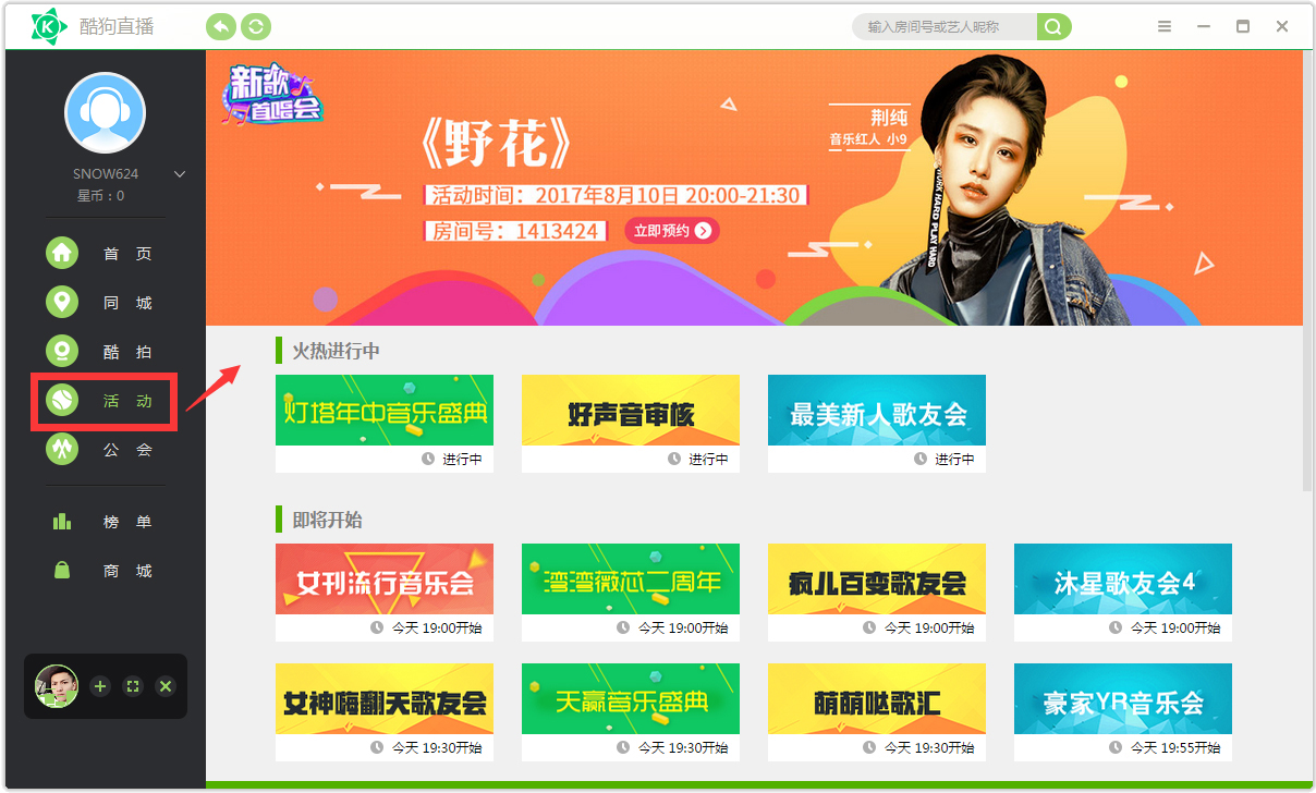 举办周星榜奖励活动,热闹时段为每周获奖主播派发礼物周星奖、点播周星奖和人气周星奖。 另外,每逢重要节日均会举办对应活动,例如中秋国庆双节时的“中秋国庆双节礼包免费领,主播互动零距离”。