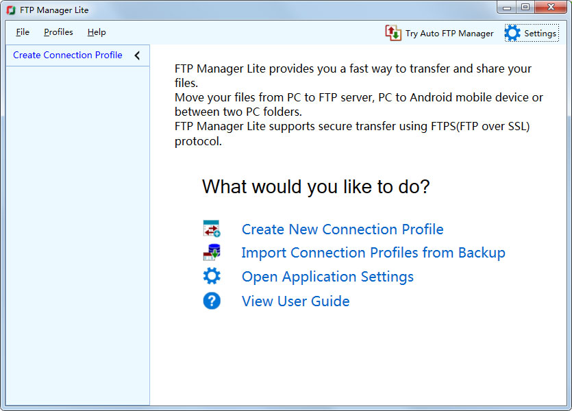 FTP Manager Lite的光滑直观的界面使数据传输变得简单。新连接的配置是连接向导的简单过程。创建连接后,在文件管理器中打开连接,您可以开始移动文件。浏览器风格的文件管理器支持所有标准操作,如删除,重命名,复制等。它还支持拖放,轻松转移,只需滑动鼠标。