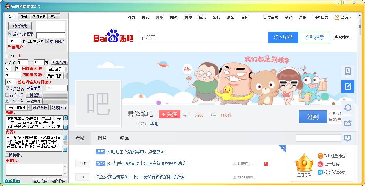 1.支持自定义多个贴吧抢楼,贴吧之间用|分开,比如:君笨笨|李毅|美女。