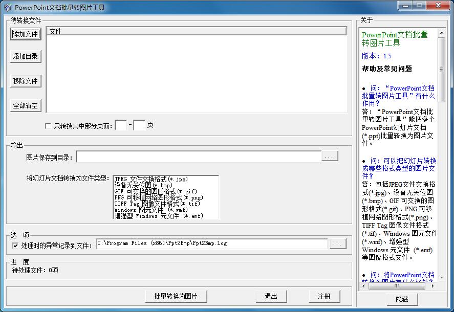 PowerPoint文档批量转图片工具能快速性将多个PowerPoint幻灯片文档(.ppt)转换为图像文件,包括JPEG文件交换格式(.jpg)、设备无关位图(.bmp)、GIF 可交换的图形格式(.gif)、PNG 可移植网络图形格式(.png)、TIFF Tag 图像文件格式(.tif)、Windows 图元文件 (.wmf)、增强型 Windows 元文件 (.emf)等图像格式文件。