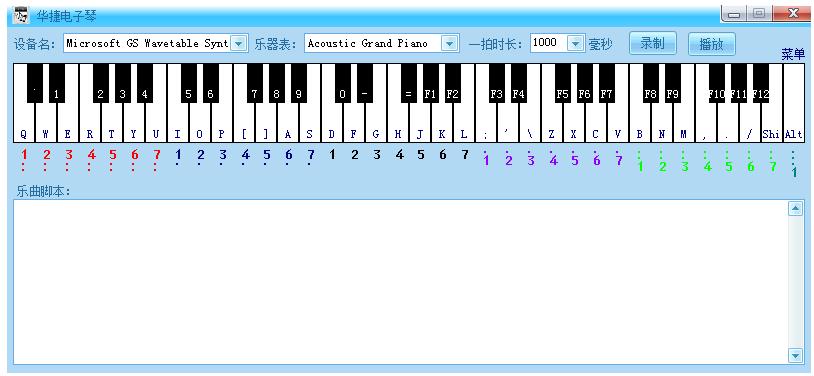 华捷电子琴是一款可以在电脑上使用键盘模拟弹奏多种乐器的软件,采用61键,可自定义对应键盘按键;可根据曲谱编写演奏脚本,也可以直接录制,支持多种乐器演奏,也可以通过它进行手动编写脚本或者自我录制,可供音乐爱好者休闲使用。