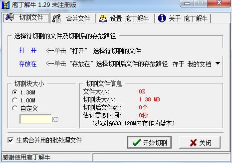 庖丁解牛是一款简单便捷的文件分割合并工具。拥有直观清晰的中文界面,允许用户将指定的文件按照自定义大小进行切割,并可以将切割后的子文件合并还原成源文件。可以满足用户基本的文件分割合并需求。