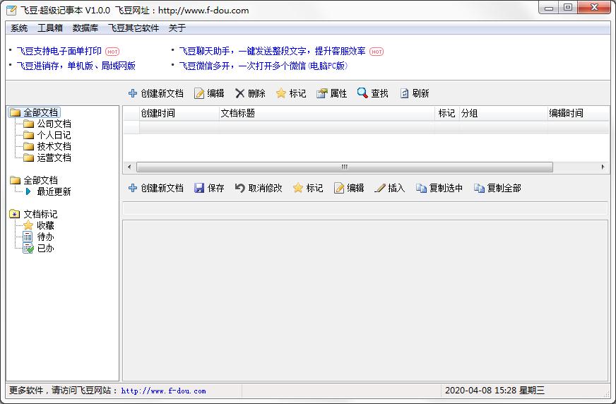飞豆超级记事本是一款文档管理编辑软件,该软件可以分组、二级分级,方便的管理、编辑多个记事本文档,飞豆超级记事本还有简单的工具箱,包含Windows计算器、记事本、命令行等工具!这是工作中必不可少的一个软件,有一个好用的记事本就不会经常工作丢三落四。