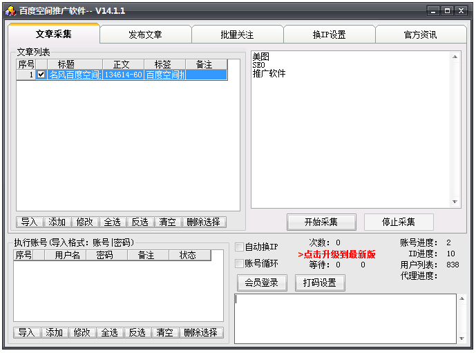 百度空间推广软件是一款功能非常强大的百度推广软件,百度推广软件支持导入大量帐号,批量采集文章批量发布,保持空间的人气提升推广效果。百度推广软件发送效率高,一个小时能发送1000篇文章,即使是大型工作室需要也能满足。