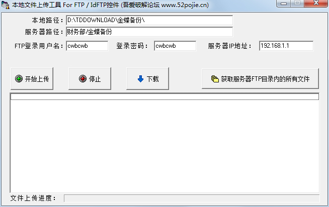 本地文件上传工具是一款非常实用的文件共享工具,该工具可以指定目录的文件上传到FTP的文件夹内,支持下载功能,能够将备份的金蝶数据库目录内的文件上传到服务器上指定的目录内。