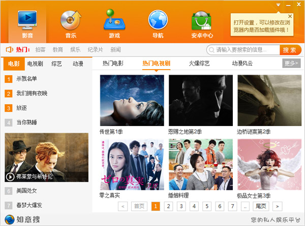 如意搜是一款娱乐搜索软件,软件内聚集了海量的影音、音乐、游戏、安卓应用和网址导航,方便用户找资源、下载资源,而且还能在浏览器中安装如意搜插件让上网变得更简单。