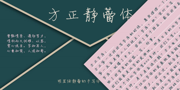 方正静蕾体由知名影视演员、导演徐静蕾创作,这也是国内首款明星字库。徐静蕾自幼习书,有十年颜体功底,其钢笔字骨骼清秀、遒劲有力。其个性优雅从容,适用于现代诗歌、短文的排版,以及文化、商业类品牌的广告语设计。