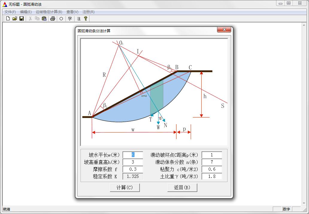 《土质边坡稳定计算》是使用土力学中圆弧滑动条分法来计算土质边坡稳定,适用于河堤、土坝、路基、高填土、山坡开挖等土质边坡的稳定计算,可显示和打印计算书。