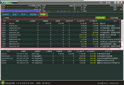 4、最后用户可以点击IP流量选项,然后可在界面中看到应用程序的的流量,从下图可以看出信息很详细,有当前IP流量和所有IP流量,用户可以点击查看,如果想要关闭其中的一个进程,所标右键点击选择结束进程就可以了。