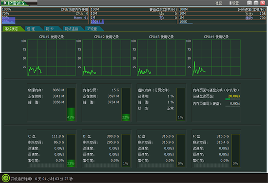 1、首先在本站下载安装好网络流量监测IP雷达软件后,打开进入软件主界面,界面有系统状态、进程、网卡、网络连接和IP流量功能选项,在界面还有详细的CPU、物理内训等信息,用户可以进行查看。