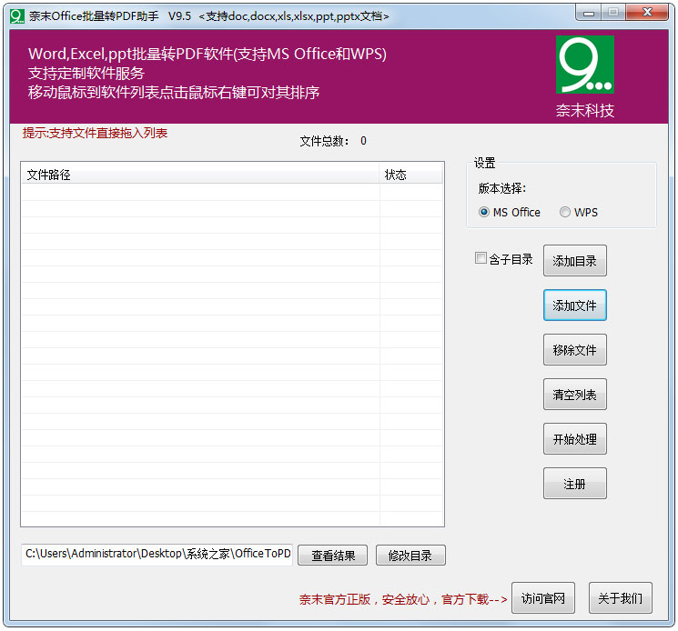 奈末Office批量转PDF助手是一款PDF转换工具,能一次性将多个Word、Excel、PowerPoint文档批量转换成PDF文件,而且无需打开文件即可转换。软件简单易用,绿色软件,解压即可用,无需安装,为需要批量转PDF业务的用户提供优秀的解决方案。