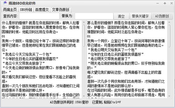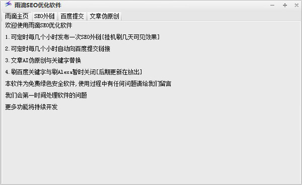 雨滴SEO优化软件是一款网友自主开发的SEO优化软件,软件拥有SEO外链工具,自动提交百度推送、文章智能AI伪原创工具等功能,可定时每几个小时自动向百度提交链接,有需要的小伙伴快来下载使用吧!