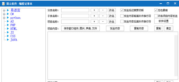 思云编程记事本是一款非常好用的小工具,这款软件可以帮助程序员记录常用程序代码。支持的编程语言有易语言、C#等等,操作非常简单,只需要几步就可以完成常用代码的保存,能够复制粘贴的资源就可以保存,快速的粘贴到程序中。