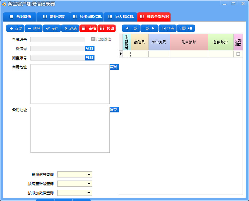 1、首先我们点击界面上的新增,使用新的系统编号,输入客户的微信号、淘宝账号和地址以及备用地址,在右侧会自动 填充上去,点击保存即可;