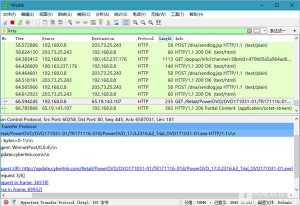 6、Packet bytes面板显示您在Packet list面板选择的包的数据,以及在Packet details面板高亮显示的字段。