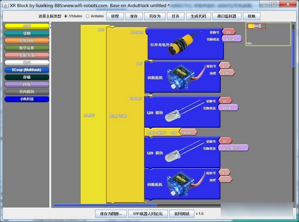 点击左侧的“小R科技”栏,可以看到我们提供的各种传感器、外设以及动作指令,把需要的传感器或逻辑块拖到右侧,根据逻辑流程挨个镶嵌上去。注意的是,我们的管脚是可以输入数字和字母的,如果是51duino平台,不能输入字母,否则无法生成代码,原因大家都知道:8051单片机管脚是没有英文字母的。