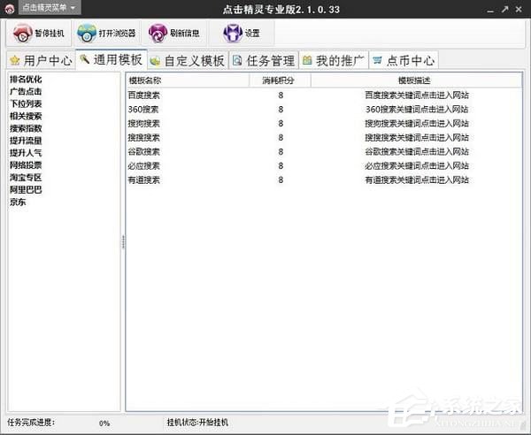2、点击“通用模板”,可选择点击精灵自带的模板类型,包括排名优化、广告点击、下拉列表、相关搜索、搜索指数、提升数量、提升人气、网络投票、淘宝专区、阿里巴巴和京东等模板,如点击排名优化,这里可选择百度搜索、360搜索、搜狗搜索、搜搜搜索、谷歌搜索、必应搜索和有道搜索,选择某个想要的模板,双击即可打开,并开始挂机;