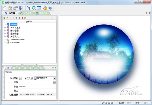 2.程序打开示例笔记库,进入主界面,现在你就可以用数据管家来管理你的个人数据了,例如,双击节点打开节点的正文,修改节点的概要与正文等。