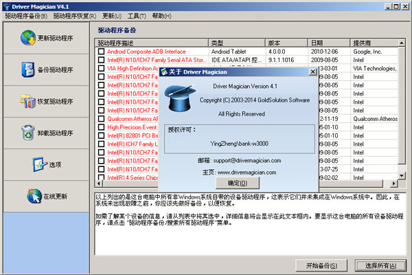 Driver Magician是一个非常容易使用的驱动程序备份工具,程序可以帮助你快速的将系统中的驱动程序备份下来,以后如果重新安装操作系统的时候你就可以非常迅速的将系统中的驱动程序还原,节省你大量宝贵的时间。程序还可以备份我的文档、收藏夹、Outlook邮箱等相关信息。