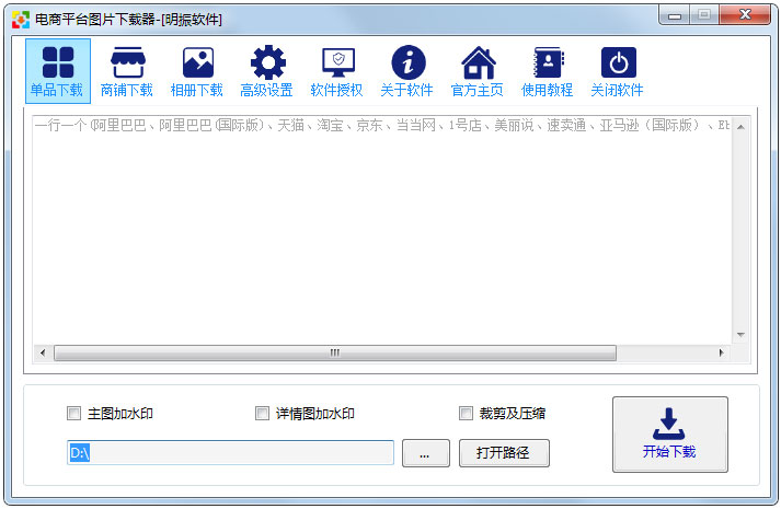 电商平台图片下载器是一款非常好用的图片下载器,这款图片下载器能下载淘宝、天猫、阿里巴巴、美丽说、速卖通、亚马逊、Ebay、京东、一号店等平台的主图、详情图、SKU图、评论图等。