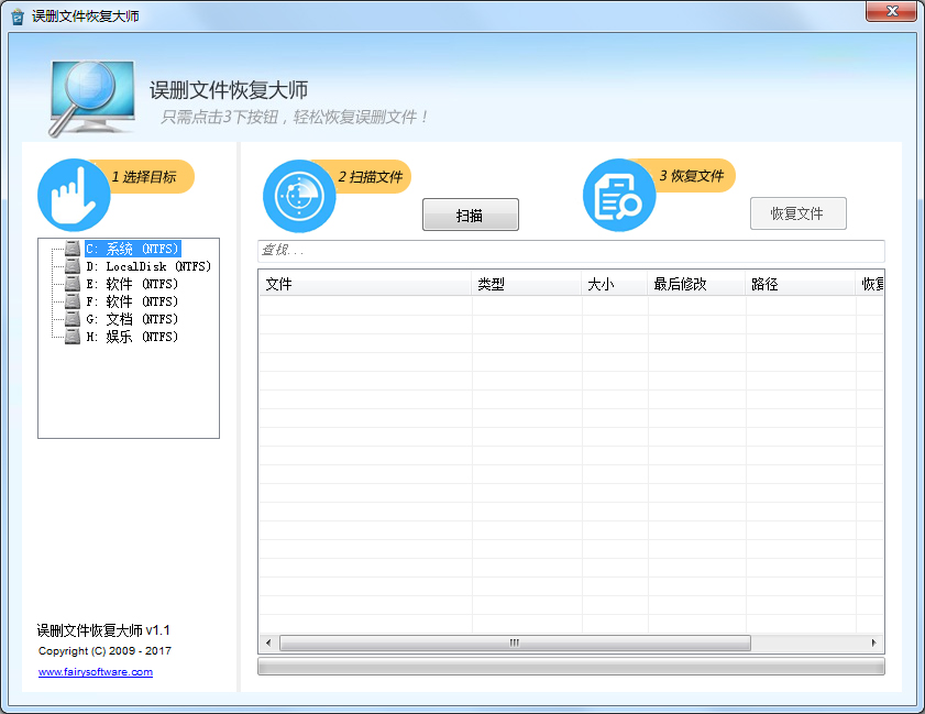 使用误删文件恢复大师恢复误删文件非常简单,没有复杂的设置、没有繁杂的选项,只需简单两步:1、扫描已删文件所在磁盘;2、选择扫描到的已删文件进行恢复。