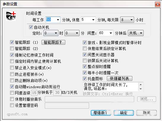 yeGuard 专门为在电脑前工作起来就不要命的人设计。运行本软件后,在任务栏出现一图标,不妨碍任何工作。到达指定的时间时,计算机将锁定键盘、鼠标和屏幕,强迫您休息一段时间。锁定前将给您两次提醒。您可以自行设定一直工作的时间和休息时间。如果您在五分钟之内没有任何键盘鼠标输入,则认为您已经休息过一次。