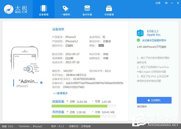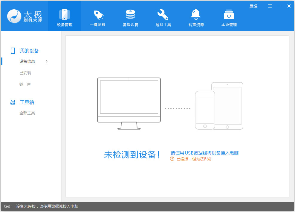 1、首先打开太极刷机大师,并将设备连接到电脑上。如果没有安装苹果iTunes驱动,需要等待一会,等待驱动安装成功之后,【设备管理】会显示当前设备的详细信息;