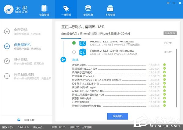 太极刷机大师是一款集手机恢复、数据备份、数据找回等多种功能于一体的软件,适合经常刷机越狱、数据丢失的同学。使用太极刷机大师可以一键刷机,一键备份数据,方便快捷。太极刷机大师提供了四种刷机模式,普通刷机模式、保留数据刷机模式、iTunes备份刷机和iTunes完全备份刷机模式,四种模式各有特点,用户可根据自己的需求来进行不同形式的刷机,让刷机只需一键!