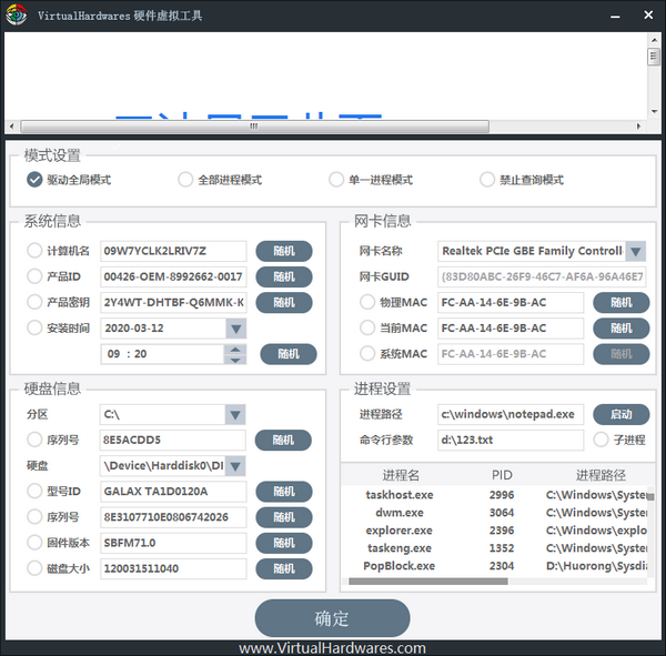 VirtualHardwares内置了查询硬件信息和随机生成硬件信息,用户不需要任何专业知识,甚至可以完全不懂硬件信息,也能快速虚拟一份新硬件信息。此外他能支持全局虚拟一份硬件信息,也支持不同进程虚拟不同硬件信息,它是完全可定制化的,是一款所见即所得的软件。虚拟硬件修改工具功能特性概括起来就是兼容性强、多重虚拟、可定制化、参数丰富。