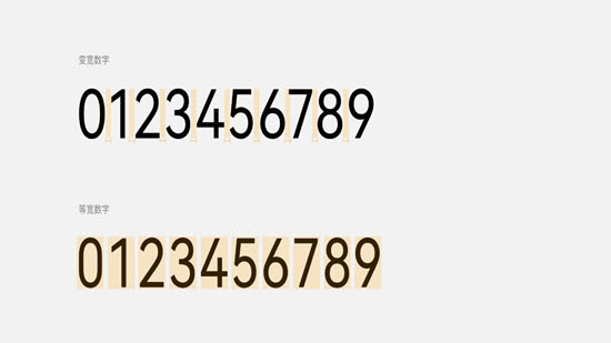 HarmonyOS Sans支持变宽和等宽两种样式。文本混排中使用系统默认的变宽数字,在阅读文本段落中能让阅读体验更加连贯。而等宽时钟数字在需要强调数值以及数据需要经常变化的表格和时钟数字的场景中使用时,可以保持数字字宽的对齐,同时更具图形化的呈现可以在界面中脱颖而出。